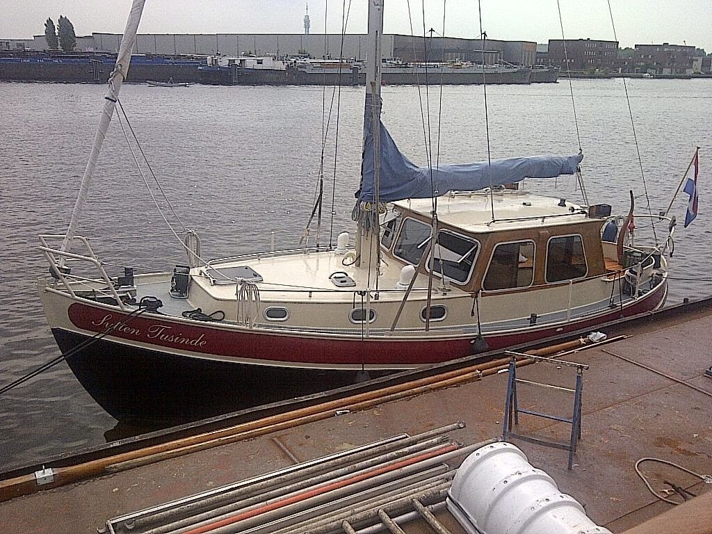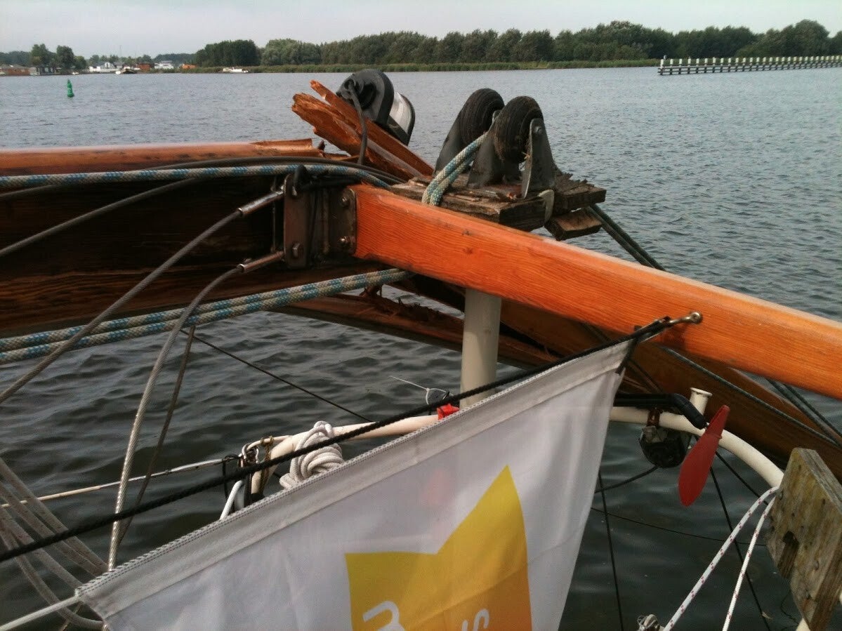 Wij konden vervolgens aan de gang met Hans Jansen uit Alphen a/d Rijn voor een nieuwe mast en giek van aluminium dit keer. Dus de boot maar weer daar in de Heimanswetering voor de deur gelegd.