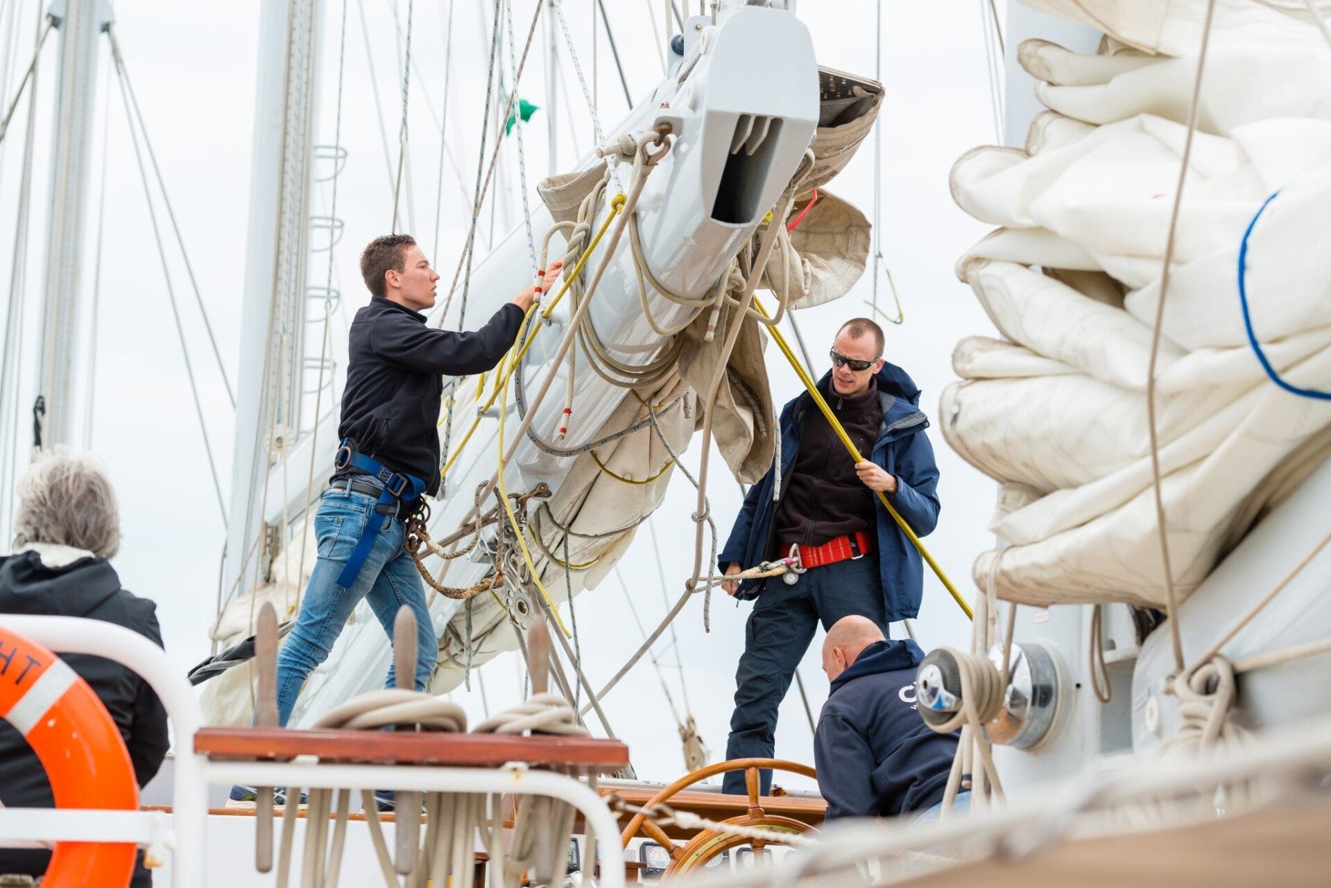 Buitenkluiver, binnenkluiver, boomfok, schoenerzeil, grootzeil en een bezaan. Bij elkaar ruim 1033 m2