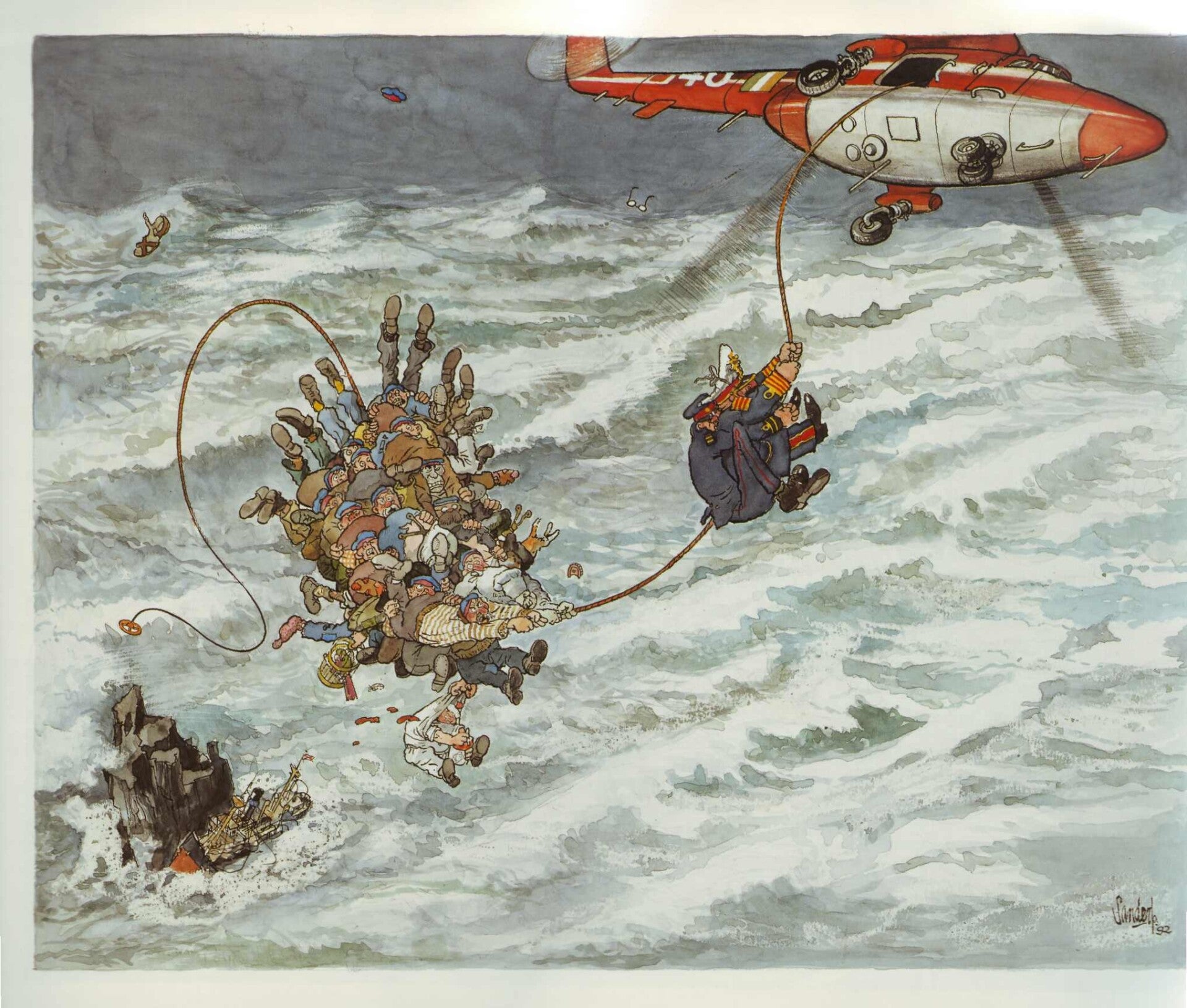 Maar het vreemde is wel met dat warme weer, ik kreeg steeds maar weer die visioenen van die Jan Sanders platen zoals deze destijds in de Sigma verfkalenders stonden afgebeeld. Aan boord van de EENDRACHT hebben we deze platen vaak bekeken en de truc was dan altijd om het matroosje, met pot Sigma rode menie, als eerste te ontdekken. (je doet soms rare dingen aan boord)